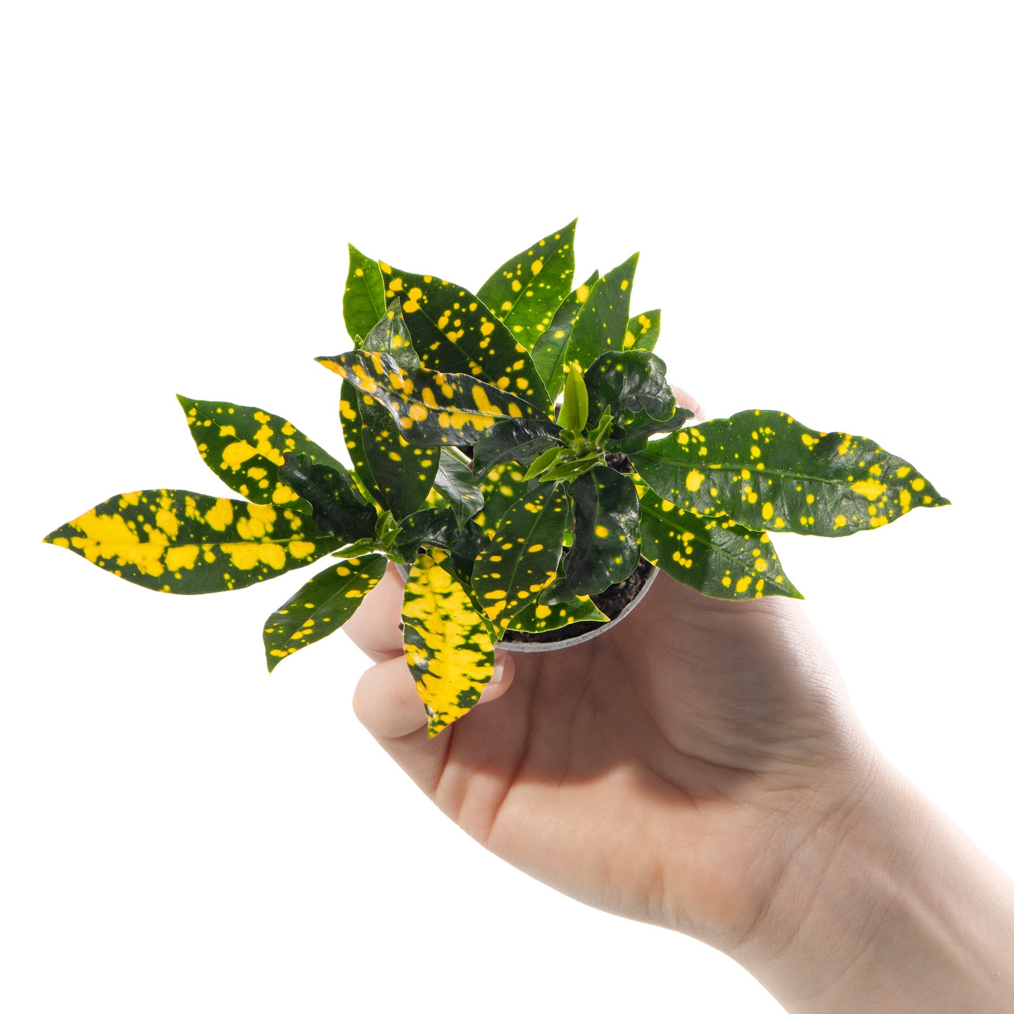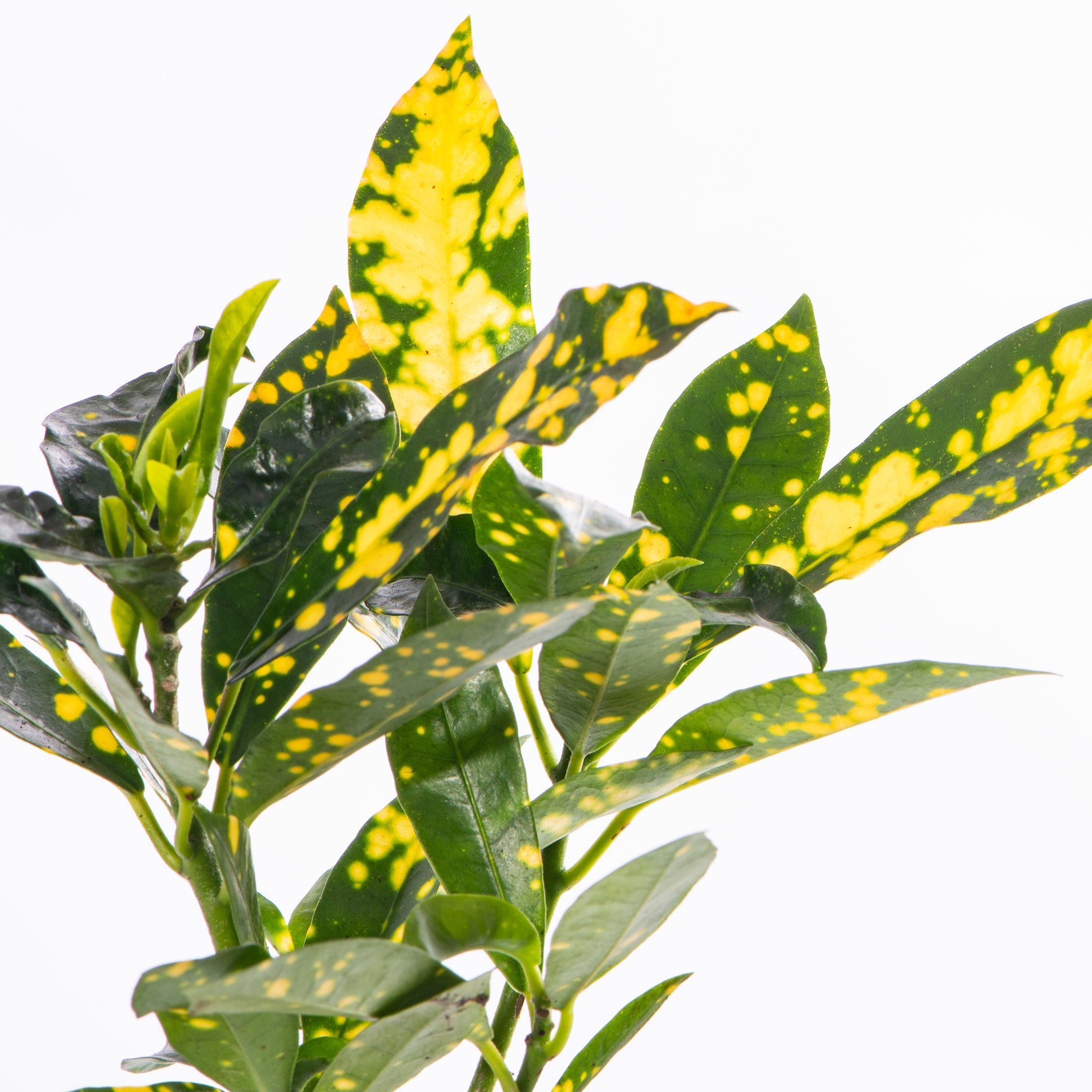 Die Kroton (Codiaeum variegatum), auch als Goldstaub-Kroton bekannt, besticht durch ihre prachtvolle, goldgelbe Panaschierung auf großen, glänzend grünen Blättern. Die goldenen Sprenkel verleihen dieser Sorte eine einzigartige Optik, die Farbe und Charme in jeden noch so kleinen Wohnbereich bringt.