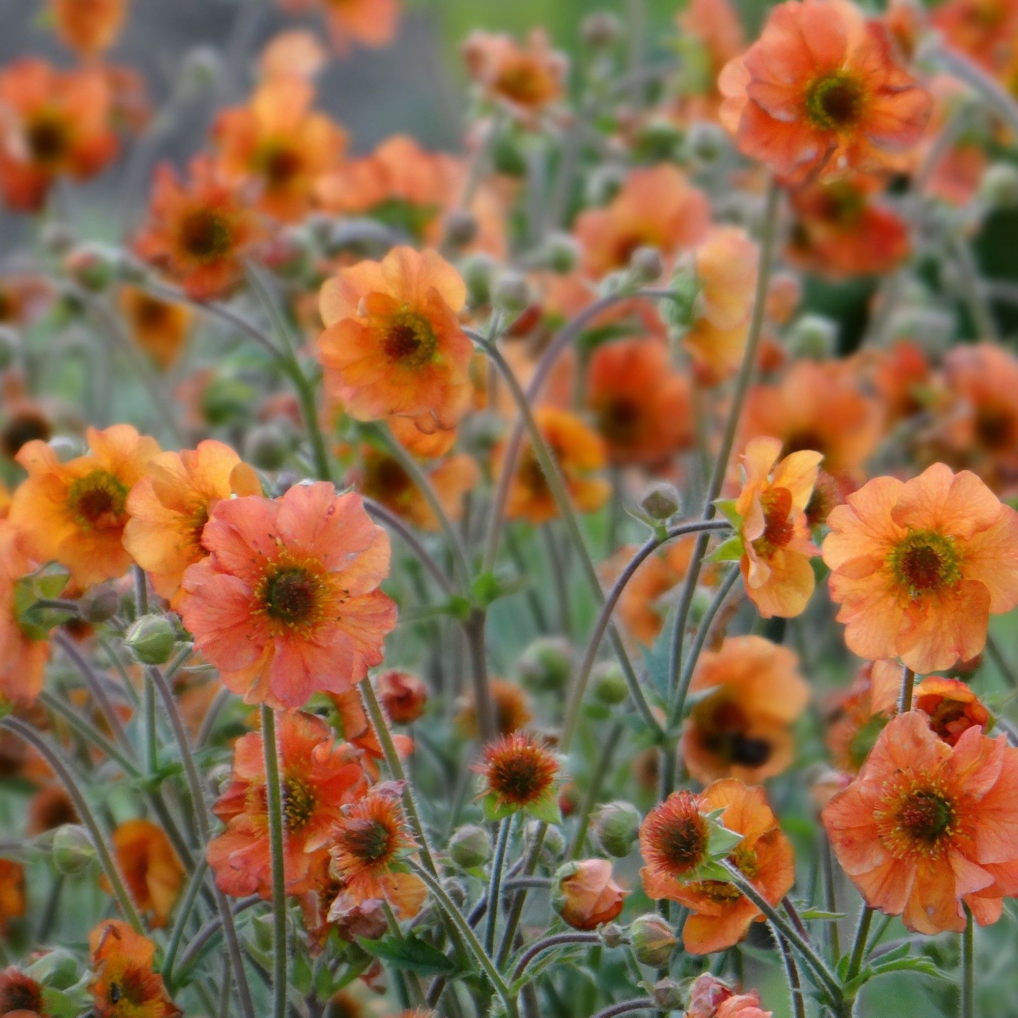 Die Nelkenwurz (Geum ‘Totally Tangerine’) ist eine winterharte Staude, die durch ihr dichtes, kompaktes, mittelgrünes Laub besticht. Aus den Blättern ragen hohe, leicht behaarte Stiele empor, die während der Sommermonate zarte, hellorangefarbene Blüten tragen. Die Blütenstiele eignen sich hervorragend als Schnittblumen für Vasen oder als Bestandteil farbenfroher Sträuße.