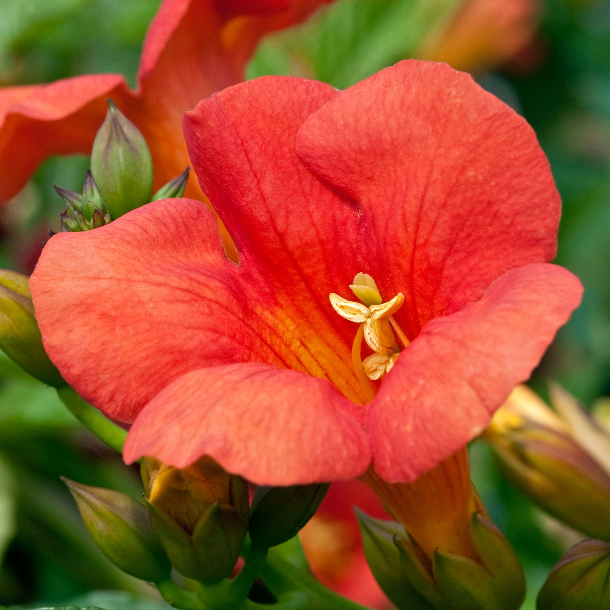 Die Große Klettertrompete (Campsis tagliabuana 'Madame Galen') ist eine einzigartige, starkwüchsige und sommergrüne Kletterpflanze, die trotz ihres exotischen Erscheinungsbildes innerhalb von Deutschland ausgesprochen pflegeleicht ist. Die mittelgrünen, glänzenden und gefiederten Blätter werden in den späten Sommermonaten von auffälligen, rötlich-orangen und trompetenförmigen Blüten mit gelbem Schlund begleitet, die in dichten Trauben an den schlingenden, verholzenden Trieben erscheinen. Im Spätherbst folgen auf die Blütezeit attraktive Samenkapseln.