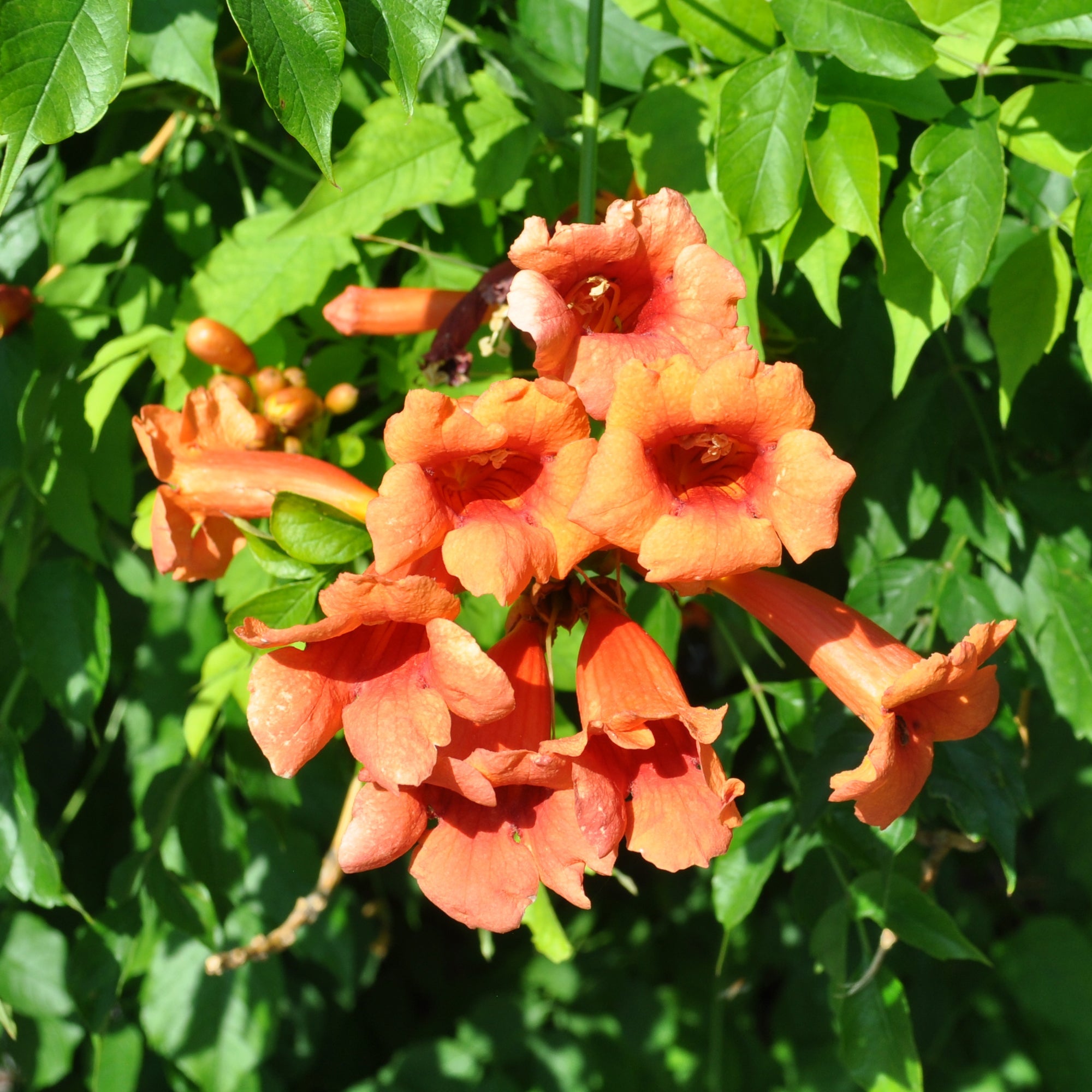 Die Trompetenblume (Campsis) ist eine schnellwüchsige Kletterpflanze; ein Rückschnitt im späten Winter hilft jedoch dabei, die gewünschte Größe und Form beizubehalten.