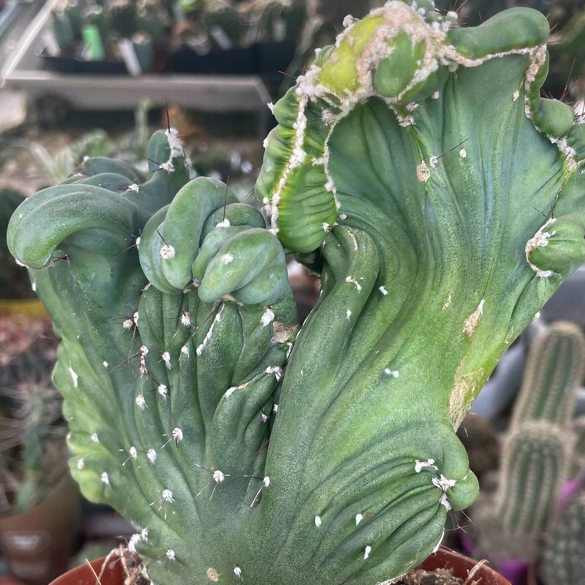 Cereus jamacaru f. cristatus is a fascinating sculptural specimen where the natural growth point has mutated, causing it to fan out into a wavy, coral-like crest rather than a single upright column. Known as the "Broken Top Cactus," every plant is unique, forming artistic ridges and folds that make it a striking focal point for a table or shelf. It is a slow-growing variety compared to its standard cousins, allowing it to remain in the same pot for several years without becoming unmanageable.