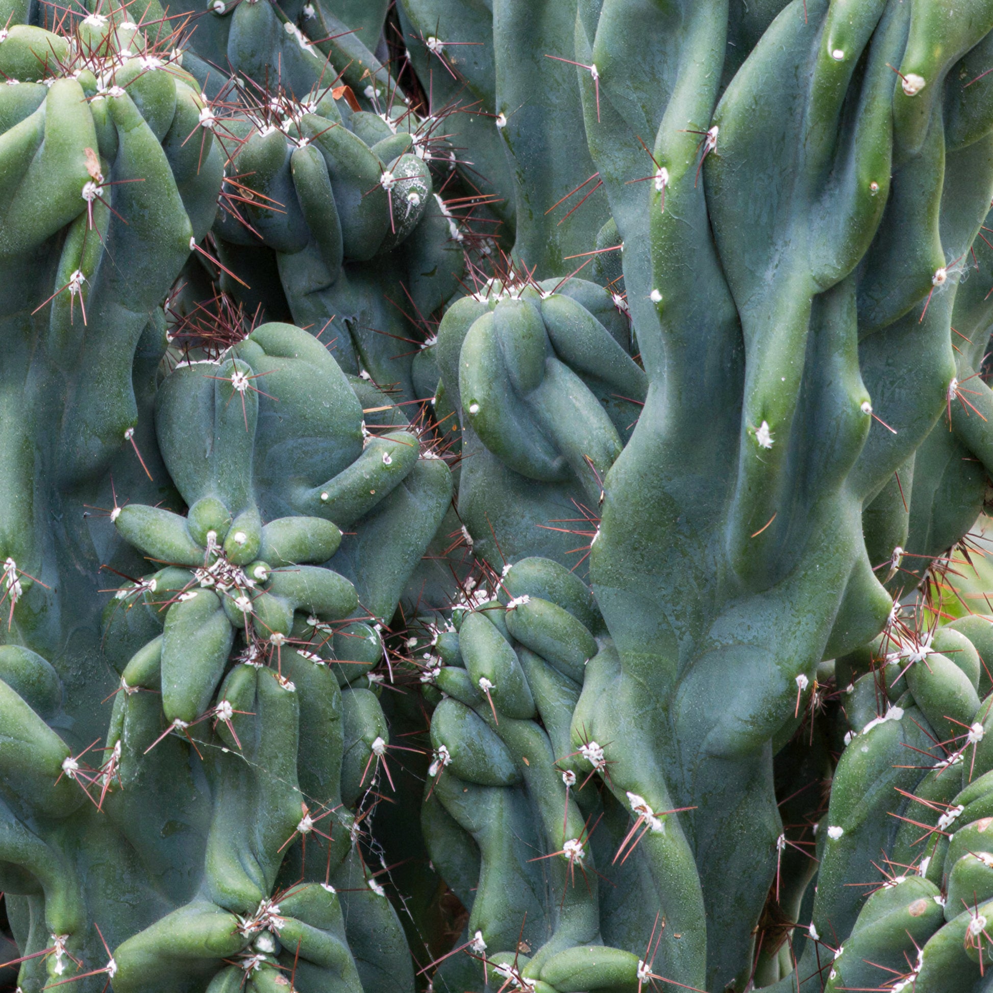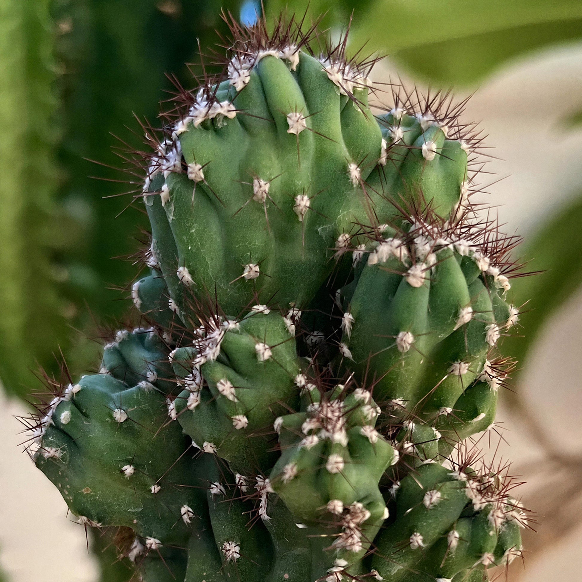 Cereus repandus 'Blue' is famous for its striking aesthetics, featuring a vibrant blue-green skin which is actually a waxy coating designed to act as a natural sunblock in the wild. It grows as a tall, ribbed column that can eventually become a large statement piece, often branching to form a candelabra shape as it ages. The vertical ribs are lined with small spines, giving it a classic cactus appearance that contrasts beautifully with modern interiors.
