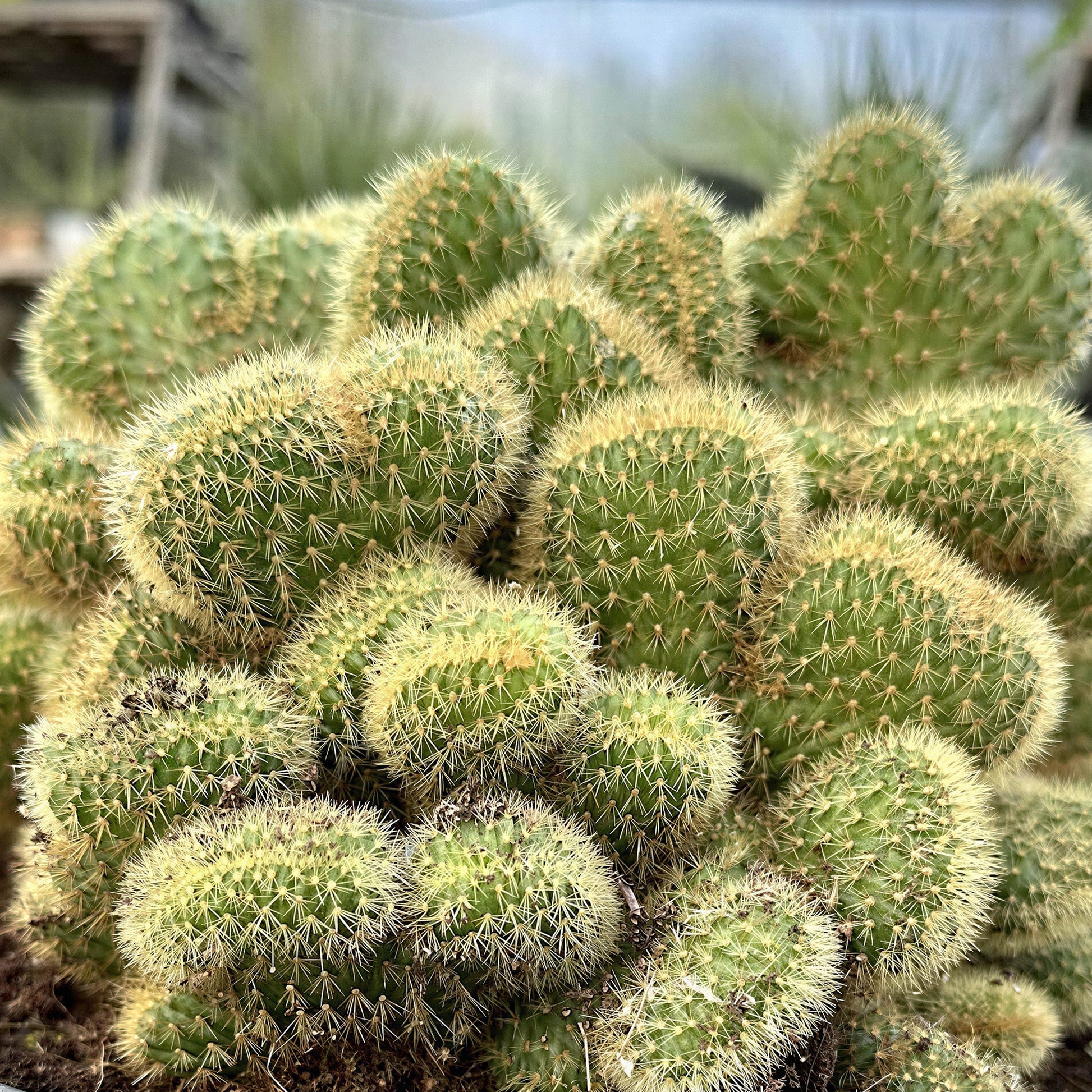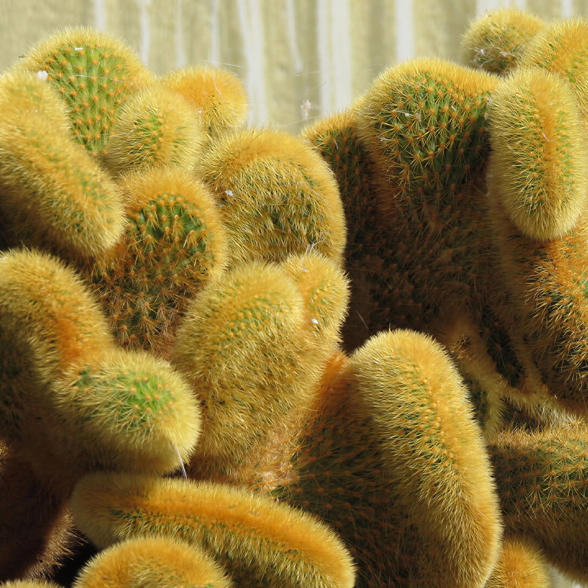 Cleistocactus winteri f. cristatus is a quirky natural mutation of the Golden Rat Tail cactus that grows in a convoluted, brain-like mound instead of long trailing stems. The winding, worm-like ridges are covered in fine, golden-yellow spines that give the plant a warm, fuzzy texture and a glowing appearance in the sunlight. It is a compact, slow-growing oddity that is perfect for small pots and detailed collections, often serving as a conversation piece due to its unusual shape.
