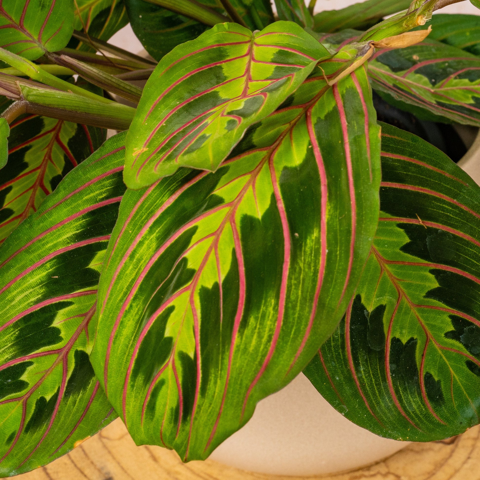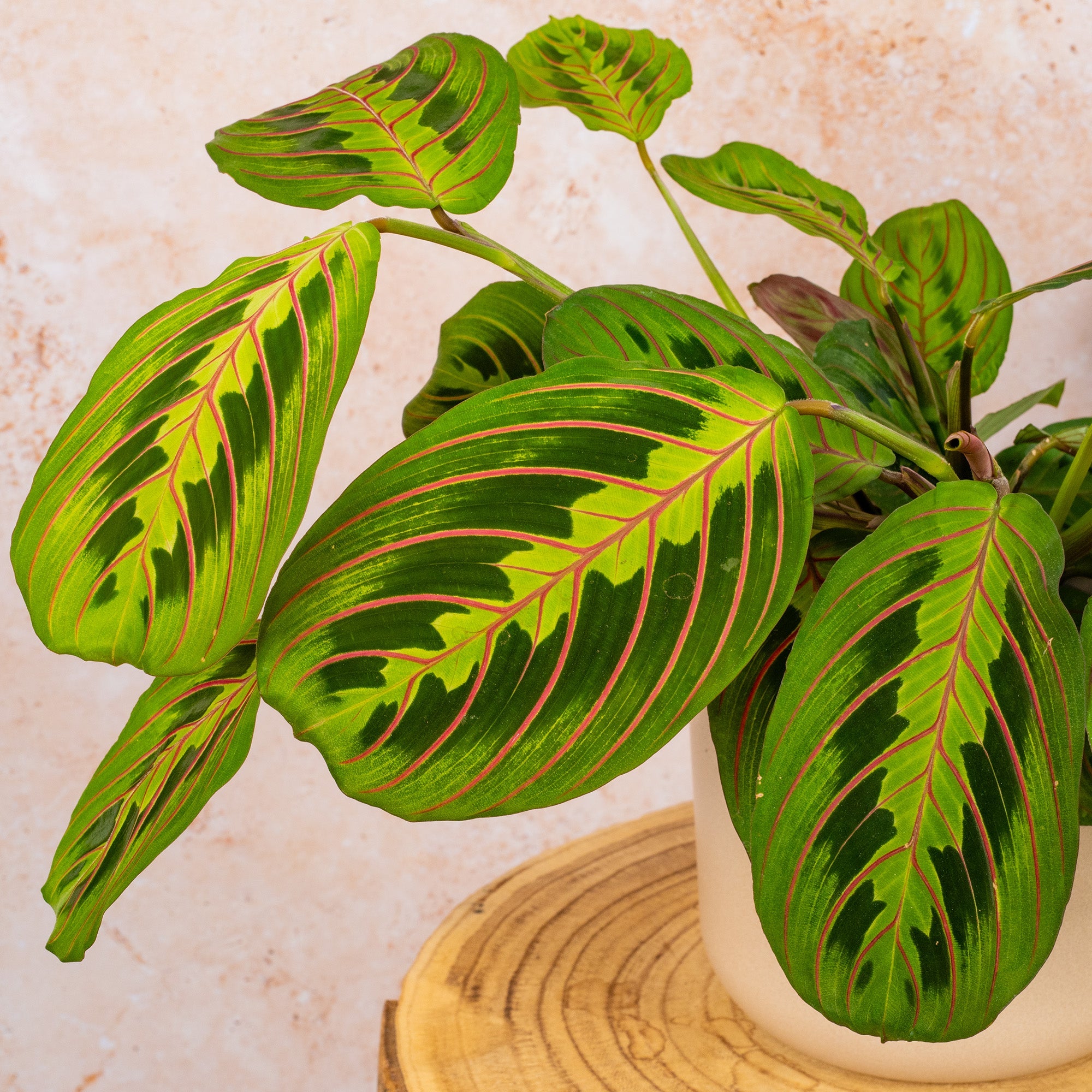 Maranta Fascinator Tricolour, commonly known as the Prayer Plant, is an indoor plant with some absolutely gorgeous, variegated foliage. The dark green base colour is the perfect offset for the stylized bright green line to join in the centre. Then, the finishing touch to the plant comes in the form of a rounded line of pink colour. The added element of it in a visual sense is the deep red underside of each leaf which, all in all, makes it a great addition for any home, office, kitchen, bathroom or hallway. The Prayer Plant will add benefits to the surrounding area with the use of its air-purifying qualities. They will remove harmful pollutants and unwanted toxins from the air, ensuring a clean and fresh atmosphere. The plant should be placed in bright, indirect light, with once-a-week watering required until lower levels will suffice in Wintertime.