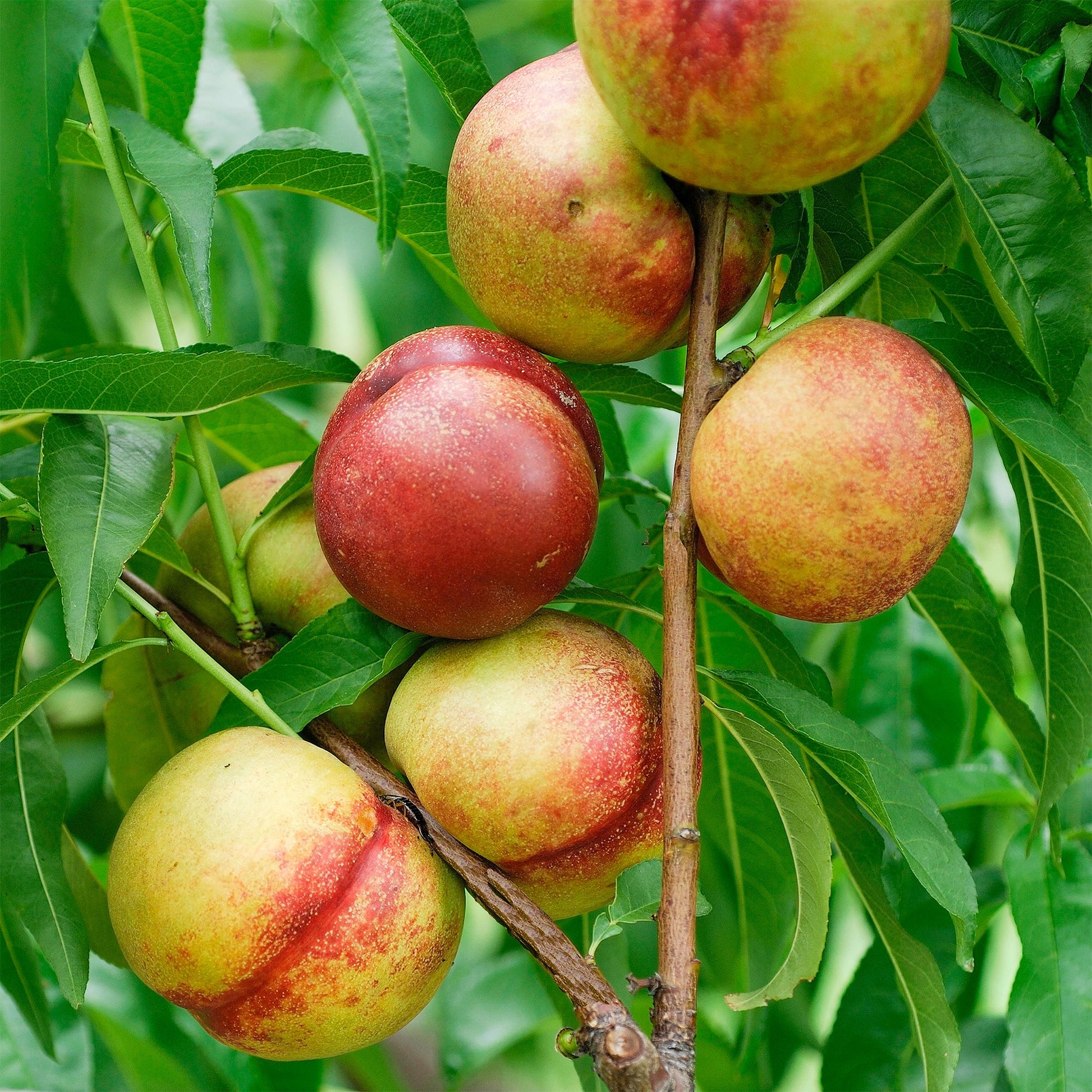 Prunus Nucipersica Nectarine Trees are a dwarf fruiting garden tree variety. Being self-fertile, they don't require additional trees to help settle. It is a reliable, easy to grow tree that should be placed in a spot where full sun is available. Make sure to keep the specimen well fed and watered.