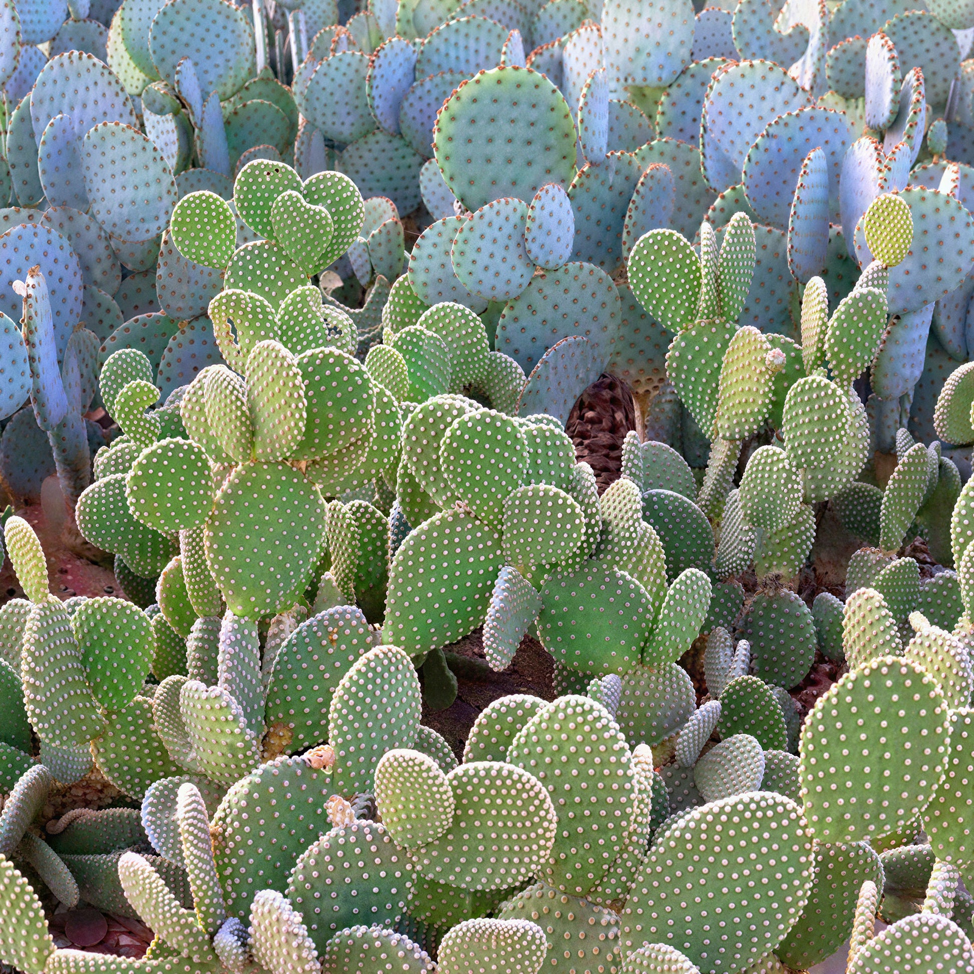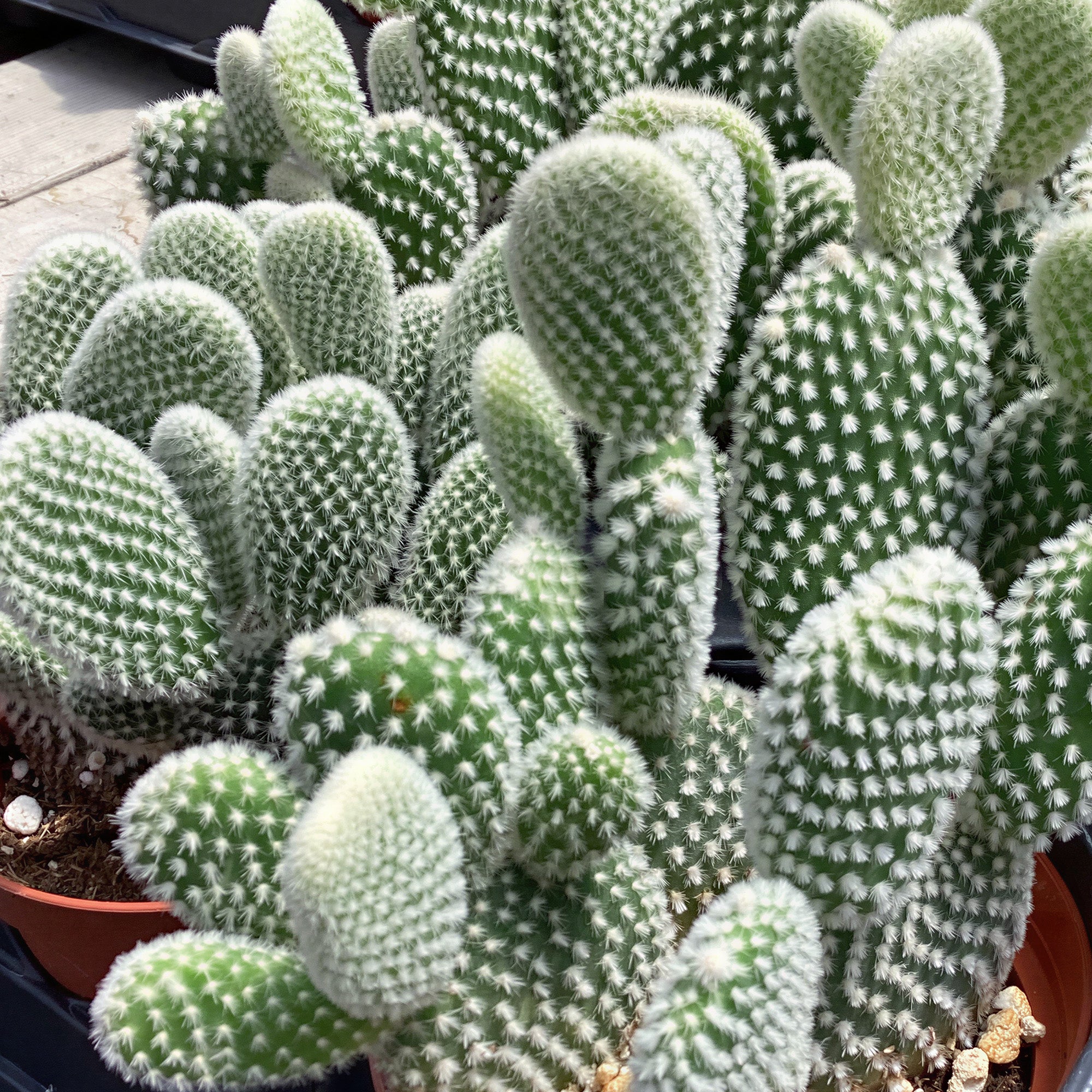 Opuntia microdasys 'Albispina' is a stunning variety of the Bunny Ears cactus that features white glochids instead of the traditional yellow, giving the plant a soft, snowy polka-dot effect. It provides a lighter aesthetic that contrasts beautifully with darker green plants. Like its cousin, the soft look is deceptive, and it must be handled with tongs to avoid the irritating bristles.
