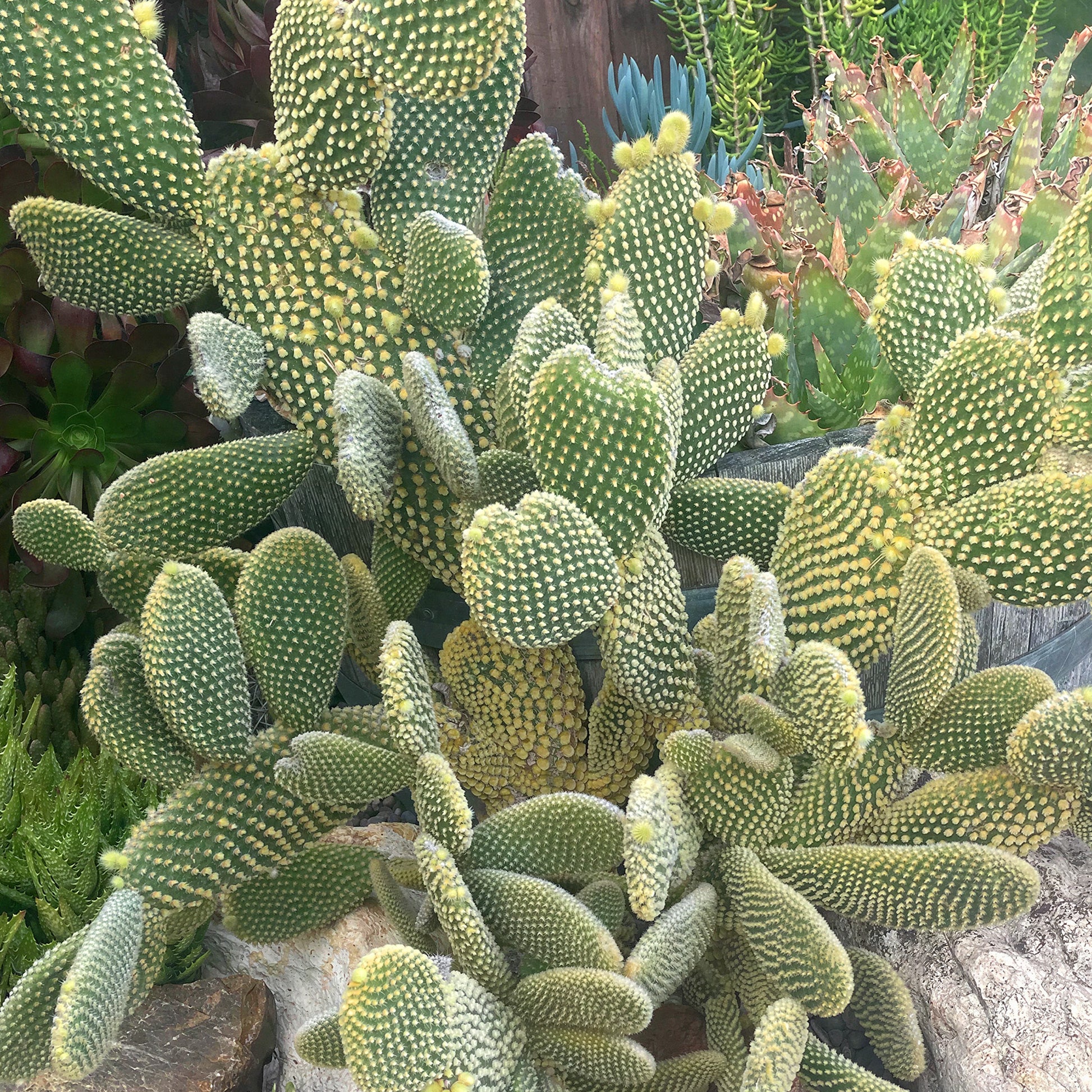 Opuntia microdasys var. pallida is beloved for its pale, lime-green pads that contrast vividly with bright golden-yellow dots. The botanical name pallida refers to the lighter, fresher green tone of the pads compared to the standard species. It forms a dense, shrubby mound over time and is armed with the same deceptive glochids as other Opuntias.