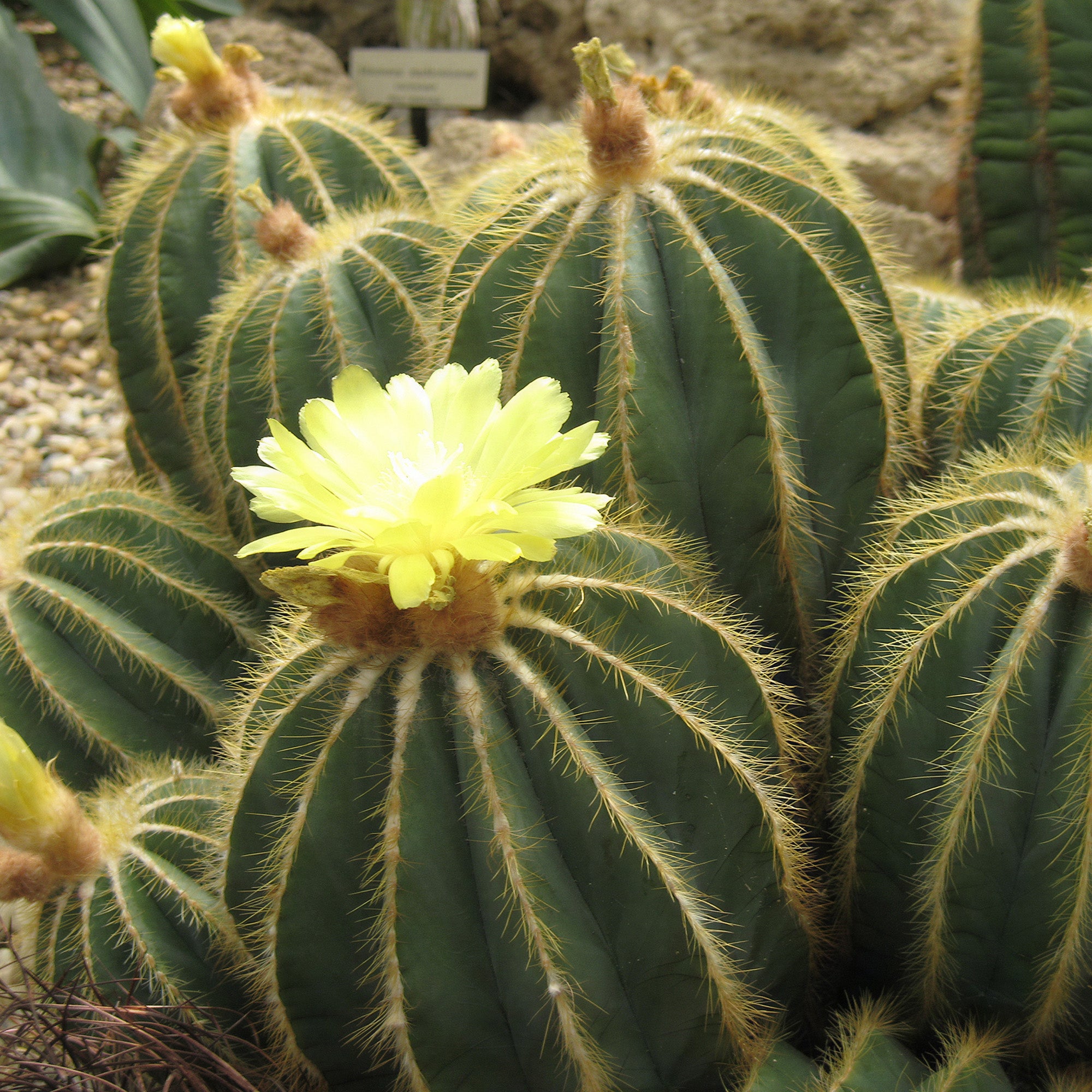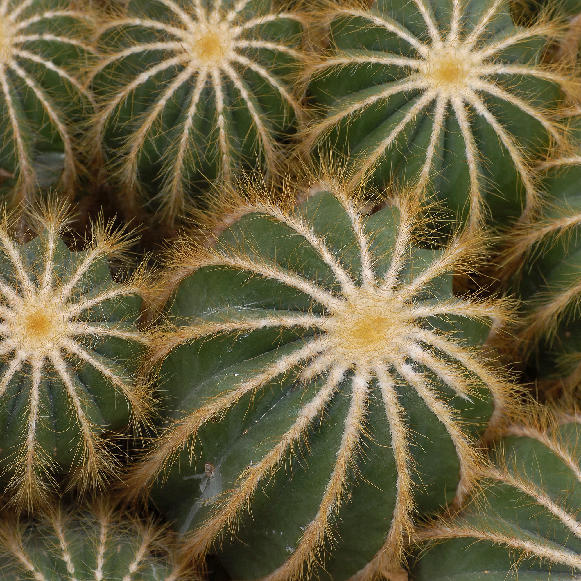 Parodia magnifica is distinctive for its spherical, blue-green ribbed body that looks like a hot air balloon, with deeply defined ribs that create strong shadows. The spines run in neat vertical lines along the sharp edges of the ribs, accentuating its geometric shape. It often forms beautiful clumps of offsets around the base as it ages, creating a mound of blue-green spheres.