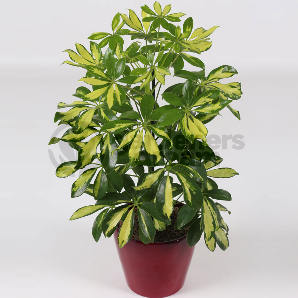 Schefflera Gerda, commonly named the Umbrella plant, is an evergreen shrub that showcases green, palmately lobed leaves with attractive yellow variegation.